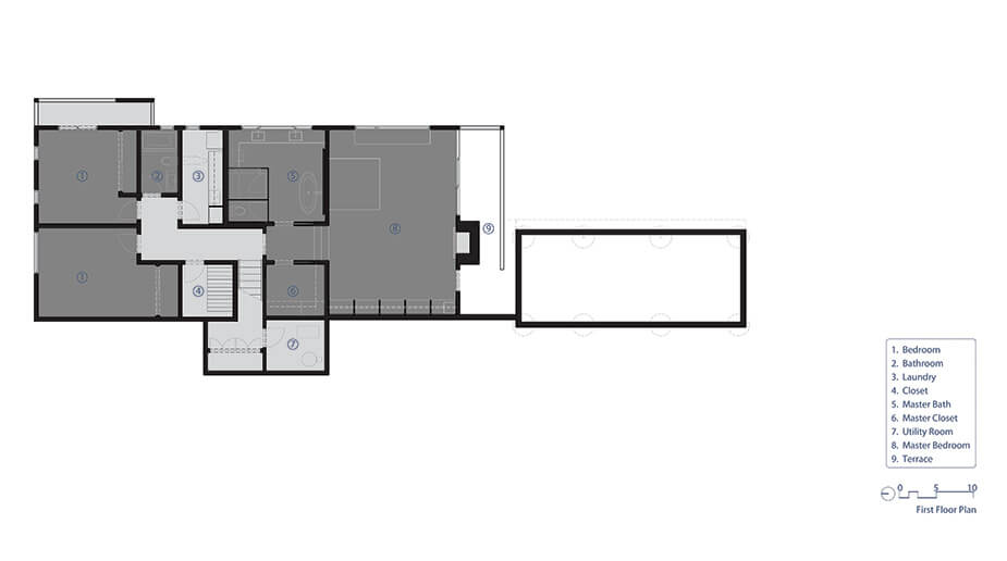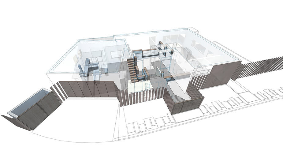 The home’s entry experience is developed to screen the courtyard and stair hall from passing automobile lights and noise. And due to the potential for panoramic views of Los Angeles and the adjacent Runyon Canyon and Wattles Canyon Parks, our design focused on creating transparency at the rear of the home with fixed and operable floor to ceiling glazing, opening the interior to the natural environment.
