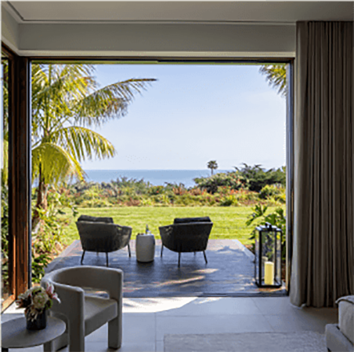 In their design for Zero 2, Burdge Architects wanted to demonstrate that net carbon design can be beautiful, luxurious, and respectful of its natural environment. Since the property had spectacular views of the natural Malibu landscape on all sides, the home was designed to have a tropical, Hawaiian feel that would showcase its surroundings. Indoor/outdoor living was a natural extension of this design focus.
