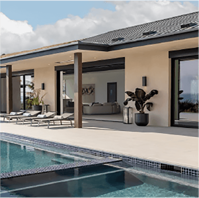 Flush mount Infratech WD-Series heaters allow for an unobstructed view of the lush Malibu scenery, whether seen through the large windows or enjoyed on the pool deck.