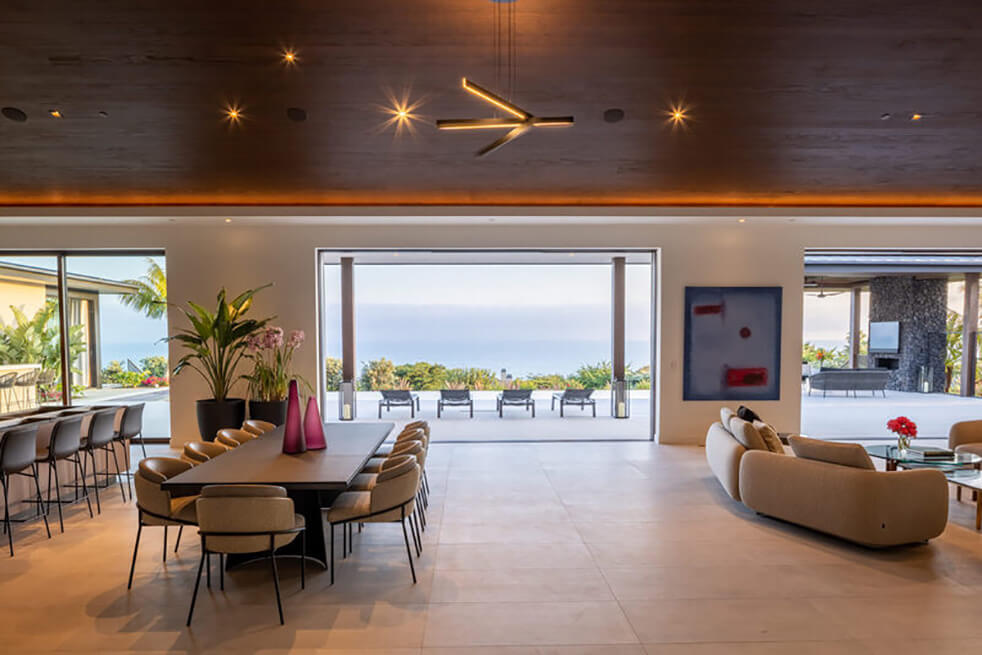 In their design for Zero 2, Burdge Architects wanted to demonstrate that net carbon design can be beautiful, luxurious, and respectful of its natural environment. Since the property had spectacular views of the natural Malibu landscape on all sides, the home was designed to have a tropical, Hawaiian feel that would showcase its surroundings. Indoor/outdoor living was a natural extension of this design focus.