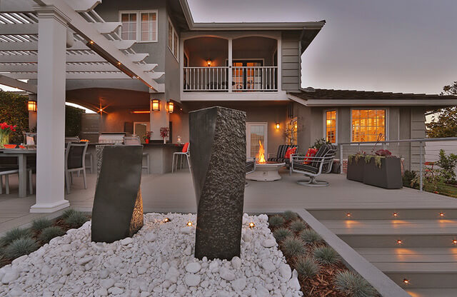 Before the Renovation Prior to the redesign, the homeowners did not use their outdoor space as often as they desired, due to the windy, foggy conditions associated with living near the beach. With an eye toward providing an enduring solution, Grabel specified materials like Trex® composite decking, LED lights, Greenform® planters crafted from recyclable materials and genuine basalt for the water feature. Goals for Project With every project, Joan Grabel collaborates with clients to develop landscapes that reflect their interests, lifestyles, tastes and goals, while balancing considerations like geography, climate, the home’s architecture and client’s budget. Goals for her work is grounded in an eco-conscious foundation, emphasizing the use of low-water plants, efficient irrigation and hardscape materials that are sustainably sourced. This environmentally-friendly philosophy guides her development of beautiful, livable and durable landscapes that create visual appeal that exists in harmony with nature. The South Bay Transitional design was developed to maximize use of the landscape for clients who enjoyed cooking and entertaining outside.
