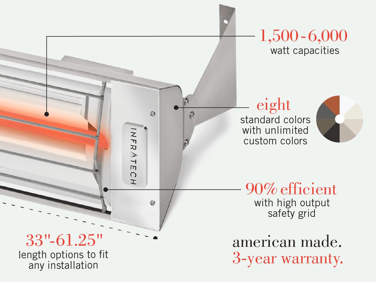 Extend the lifespan of your Infratech heater in climates with exposure to saltwater and other extreme elements with our new Marine UpGrade. It combines the designer-friendly profiles of our products with our most durable, high-grade anti-corrosive 316 stainless steel construction. While all Infratech heaters feature corrosion-resistant 304 stainless steel, 316 is a highly metallic element that offers enhanced protection and enduring style in coastal, alpine, windy, humid and other demanding conditions.