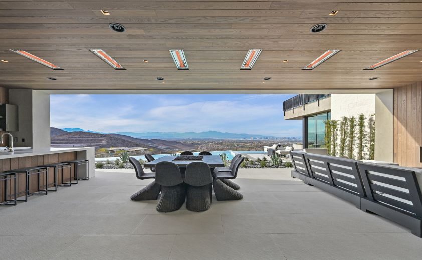 Located in Ascaya, a high-end home community in Henderson, NV with spectacular mountain views of the Las Vegas Valley, The New American Home features a home office, an exercise space, a spa, a game, room, a two-car garage, a rooftop deck, outdoor fire features, and floor-to-ceiling, sliding-glass-doors to frame the beauty of the outdoor surroundings, in addition to the usual bedrooms and bathrooms. The outdoor living spaces include 6 Infratech WD-Series 39″ Heaters with flush mount frames, integrated into the home’s smart home system with the Home Management Panel.