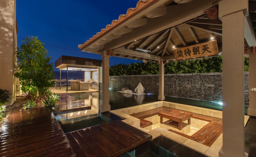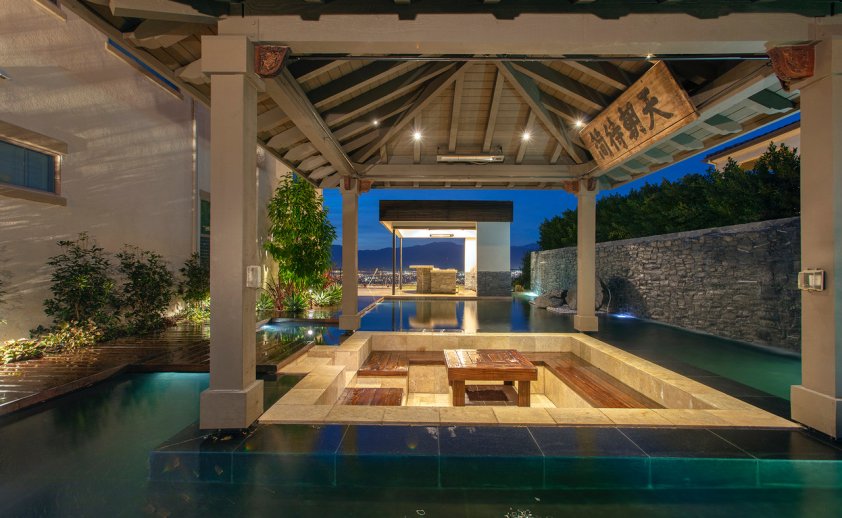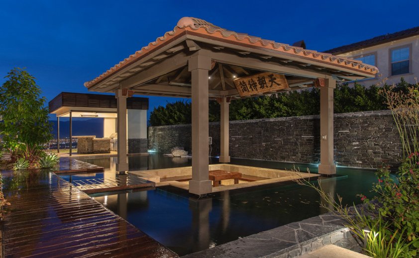 The inspiration for this outdoor living space was definitely influenced by ancient Chinese elements with real antique doors and accessories we sourced from China.