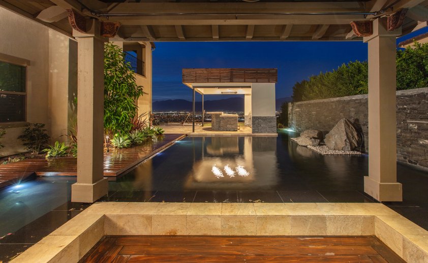 The West Covina Outdoor Zen Garden is different than other outdoor spaces because it is so different than other yards we have done in the past. The large water feature we had incorporated in this yard has seating areas within it so when they are in it they feel like they are surrounded by water. Also the waterfall provides a nice focal point for the yard it spans across. Another interesting feature is the BBQ island which has a built in teppanyaki so the guest can have an exquisite dining experience when they are in the yard.