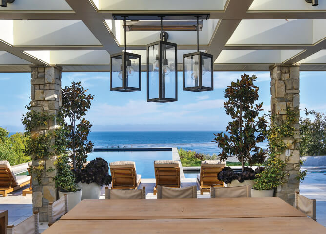 Hoppel and the Burdge team created a stunning, two-story Cape Cod-style home and separate guest house on a private bluff in Malibu that boasted panoramic ocean views. The residence makes the most of its breathtaking location with custom French doors throughout that let in sea breezes and dazzling scenery. Its design incorporates an owner’s suite distinguished by a fireplace and wraparound oceanfront deck. To make the most of its seaside setting, Hoppel and the team designed an open-air pavilion with a fireplace, outdoor kitchen with pizza oven, grill and two stone-crafted bars that flow to the pool, spa, sunken lounge area and firepit. The covered pavilion has a trellised ceiling treatment that mirrors the horizon. Hoppel and the team chose WD-Series heaters for the space because they could be flush mounted into the trellis, maintaining the design’s clean lines while generating significant heat output for multiple gathering areas.