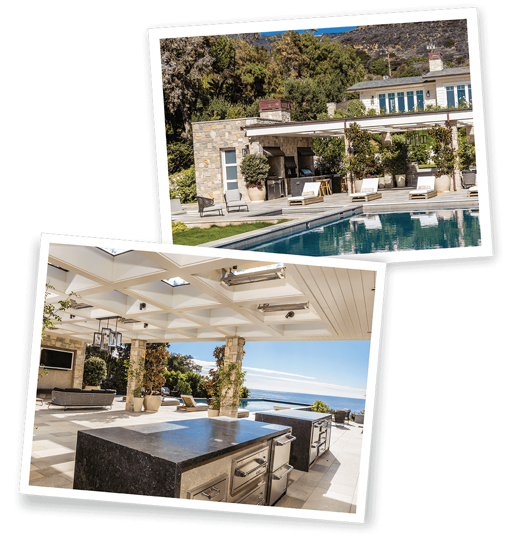 Hoppel and the Burdge team created a stunning, two-story Cape Cod-style home and separate guest house on a private bluff in Malibu that boasted panoramic ocean views. The residence makes the most of its breathtaking location with custom French doors throughout that let in sea breezes and dazzling scenery. Its design incorporates an owner’s suite distinguished by a fireplace and wraparound oceanfront deck. To make the most of its seaside setting, Hoppel and the team designed an open-air pavilion with a fireplace, outdoor kitchen with pizza oven, grill and two stone-crafted bars that flow to the pool, spa, sunken lounge area and firepit. The covered pavilion has a trellised ceiling treatment that mirrors the horizon. Hoppel and the team chose WD-Series heaters for the space because they could be flush mounted into the trellis, maintaining the design’s clean lines while generating significant heat output for multiple gathering areas.