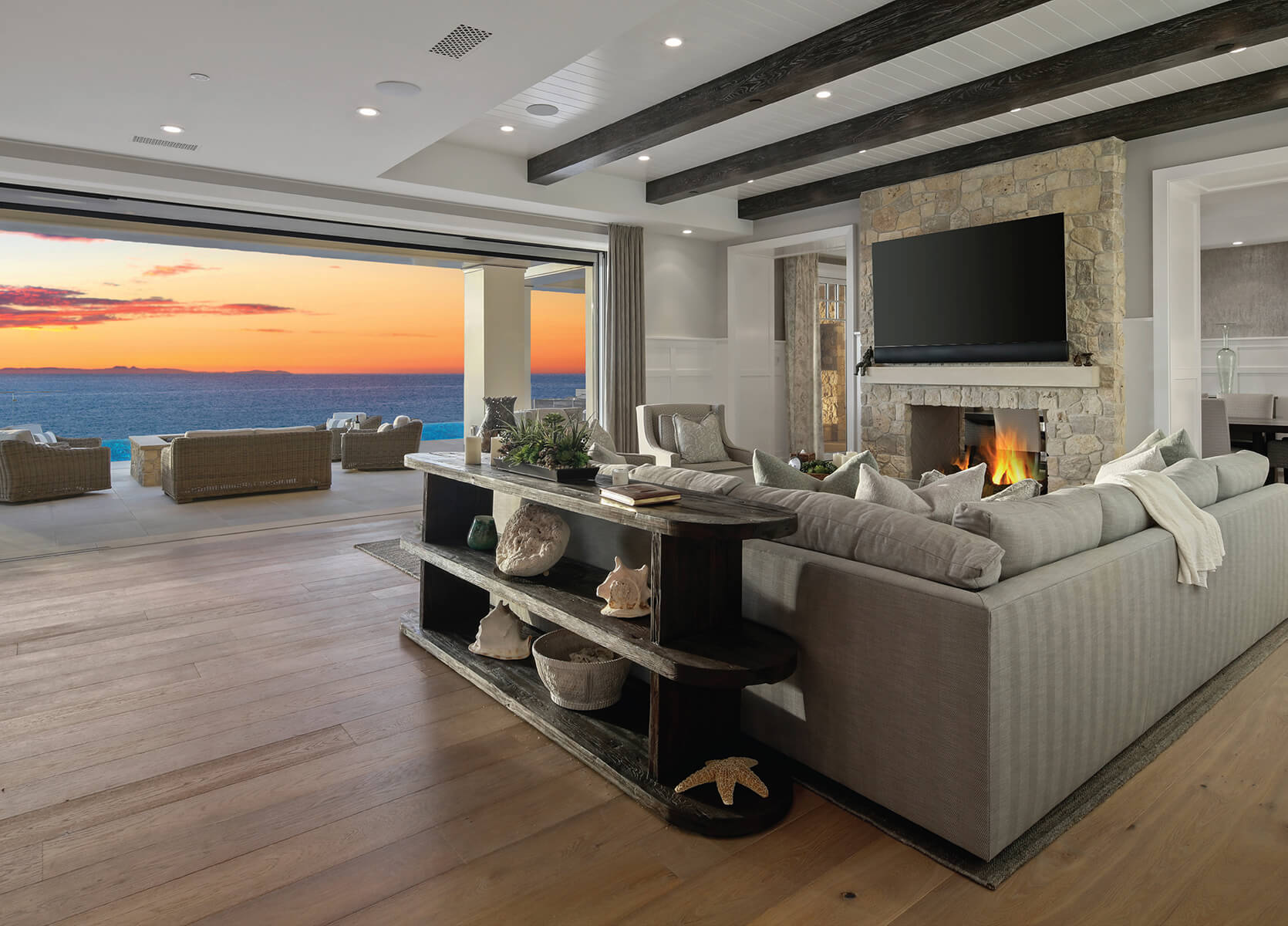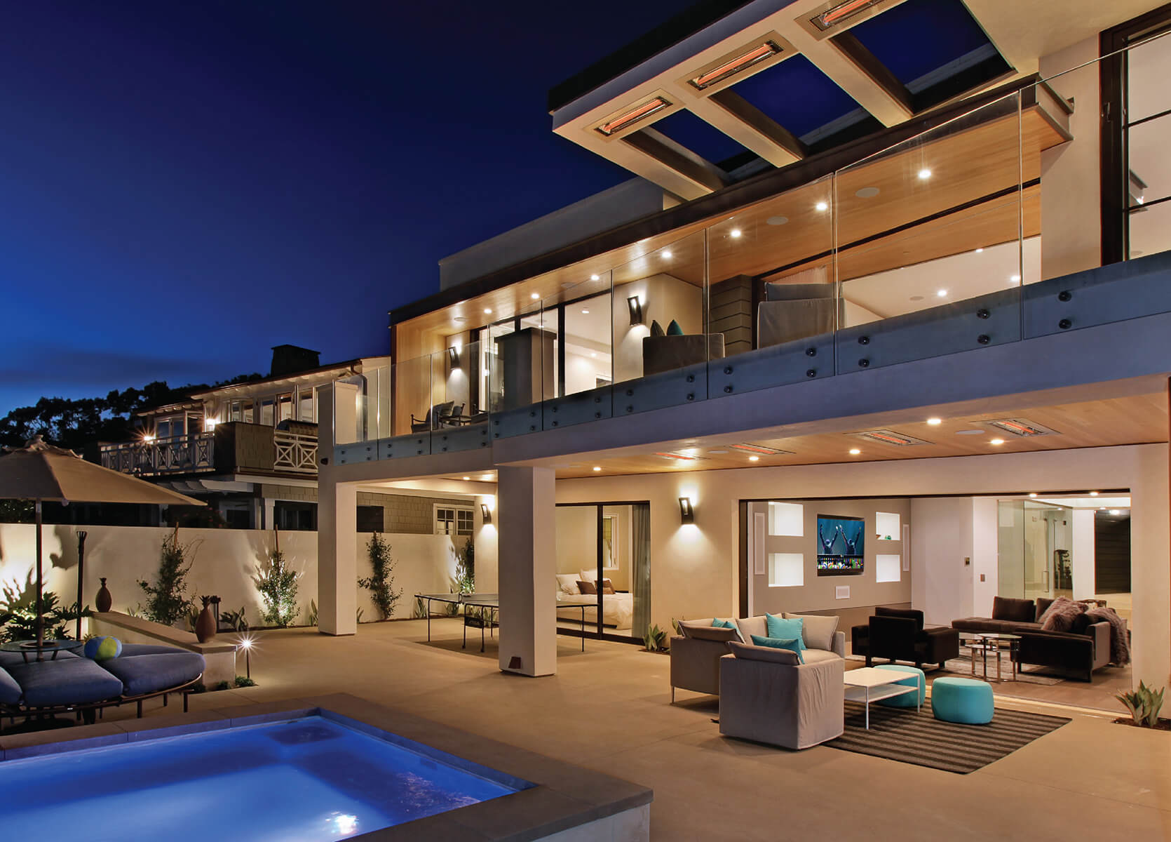 Patterson and his team collaborated with architect Chris Brandon to build a home in the Strand at Headlands in Dana Point that made the most of stunning views of the Pacific Ocean. One of its many features includes a back patio accessible via pocket doors that can be opened to foster a seamless engagement between interior and exterior spaces. Patterson and his team raised the stone decking of the patio so that it is flush with the hardwood floors inside. A negative edge, rimflow pool at the same height creates a sweeping expanse that gives out onto the ocean. They installed an Infratech heating system on the covered patio so that clients can enjoy the view during chilly or windy weather. An Infratech heater was also mounted to the master balcony trellis so that homeowners can spend their evenings relaxing in comfort.